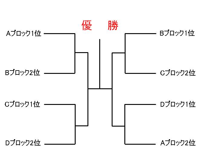 決勝トーナメントの組み合わせは、Aブロック1位−Bブロック2位、以下C1−D2、D1−A2、B1−C2、